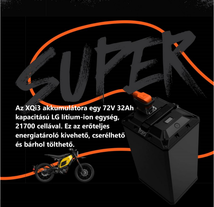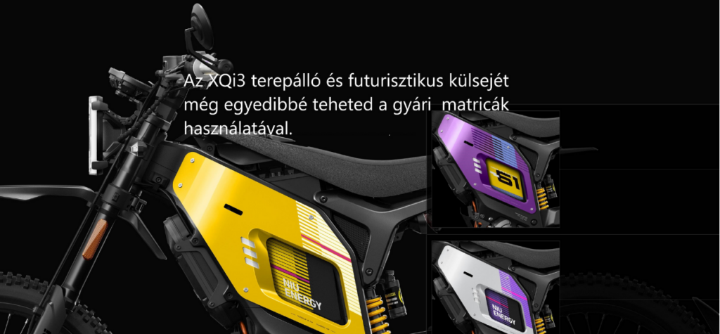 Az XQi3 a városi intelligens közlekedés forradalmát vezető NIU első elektromos terepmotorja. Rögtön kétféle kivitelben érheted el: a kizárólag terepre szánt XQi3 Wild krossz verzió, valamint a street legal XQi3 Street endúró. Mindkét modellt középmotor hajtja, mely a 8000 wattos csúcsteljesítmény mellett 357 Nm nyomatékot visz át lánchajtással a hátsó kerékre. Elöl 19, hátul 20 hüvelyk méretű terepgumik kapaszkodnak a talajba, az akadályok leküzdését segíti a masszív, elöl-hátul állítható felfüggesztés is. A kezelhetőséget a precízen tervezett villaszög és a harapós, szinterezett betétekkel ellátott tárcsafékek mellett a mindössze 76 kilogrammos önsúly is segíti. A hatótáv, köszönhetően a 72V 32Ah kapacítású akkumulátornak, mindkét modell esetén 90 kilométer. A végsebességben azonban van különbség: az XQi3 Wild krossz kivitel 75, míg a segédmotor kategóriás Street kivitel 45 kilométeres legnagyobb sebességgel rendelkezik. A négy színben (fekete, fehér, sárga és lila) érkező motorok külseje a háromféle gyári matricaszettel még egyedibbé tehető. Az XQi3 természetesen kompatibilis a NIU okosalkalmazással, emellett Bluetooth és NFC kapcsolatot is kezel, a frissítésről OTA (over the air) rendszer gondoskodik automatikusan.